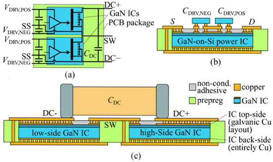 PCB-embedded half-bridge with on-package capacitors; (a) schematic of integrated circuit, (b) on-package gate-supply capacitors for low-inductive gate loop, (c) on-package dc-link high-voltage capacitors for low-inductive power loop. Reproduced from [] under the terms of the Creative Commons Attribution 4.0 license.