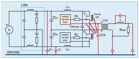 The implementation case study has been focused on the example of a half-bridge inverter leg based on lateral e-mode GaN HEMTs, as in Figure 8 []. The inverter is supplied from a DC voltage source, Vi = 250 V, through the line impedance stabilization network LISN. Two input capacitors divide the voltage into Vi/2 to create a 0 V midpoint connection for the load. The operation frequency has been set at fs = 250 kHz. The inverter is feeding the resistive–inductive load L-Rload. Power loop inductance is represented by the bus bar inductances Ls+/Ls−. The layout of stray capacitances is marked red, including the main common mode capacitance CCM at the inverter output midpoint. To limit the CM current circulation path through the load circuit, the CM filter LCM is inserted at the inverter output. The inverter utilizes a four-layer PCB to provide a high level of integration between discrete components and PCB copper layers (planes, polygons), vias, and tracks []. The three tested design techniques adopting the top-side cooled e-mode GaNs are discussed below.