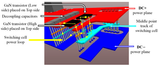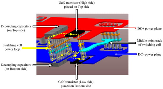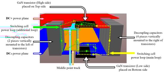 Despite the advanced assembly of IPSs, some indispensable interconnections to external decoupling capacitors of the gate supply or the dc-link rail are needed. To limit parasitic inductances, PCB embedding with the placement of on-package decoupling capacitors is proposed [], as in Figure 7. Another analytical treatment of the PCB-embedded GaN modules in terms of electrical and thermal performance is presented in [].