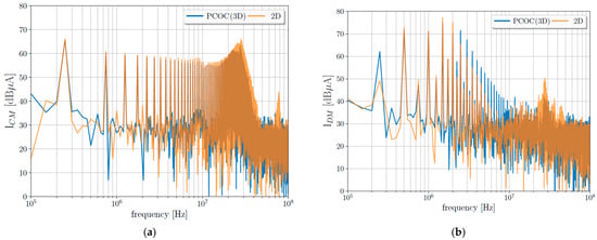 The experimentally measured current noise spectra of the shielding boards for 3D and 2D layout configurations are compared in Figure 12. For the 3D PCoC layout, slightly better attenuation of the CM current spectral envelope is obtained in the whole frequency range. For the DM current, the noise attenuation improvement for the 3D layout is even more significant, except for the frequency range between 2 and 10 MHz, where the 2D solution is more effective.