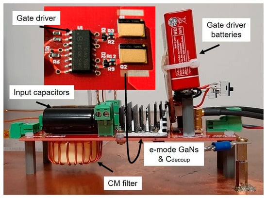 Figure 13 illustrates the half-bridge inverter setup with a zoom on the four-layer PCB planar 2D layout of GaN HEMTs (2xGS66506T), assuring close connection to the isolated gate driver (Si827x). The decoupling capacitors (6 × 100 nF) are placed in two stacks at the bottom side of the PCB package, under the transistors. In order to minimize CM capacitive coupling of the gate driver power supply, the battery board of the batteries is mounted perpendicular to the main board.