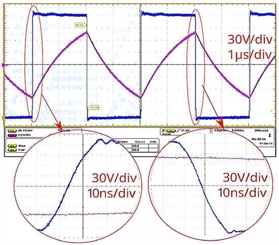 Figure 14 depicts the oscilloscope record of the half-bridge inverter’s steady-state operation. All four consecutive conduction states (with subperiods of bidirectional current conduction of GaNs), being the result of the resistive–inductive load, are present. The zooms of voltage waveforms at turn-off transients show the significantly reduced voltage overshoots, validating the design layout with minimized power loop stray inductance.