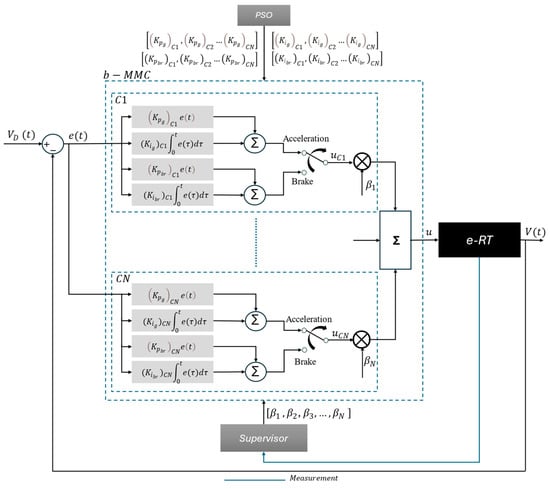 In Figure 1, an error signal is generated from the input of the reference drive cycle and feedback of the plant model of the refuse truck. This error signal serves as the input to the main controller, which, in turn, calculates the optimal controller parameters for the accelerator and brake pedals using the bMMC (blended MMC) approach and PSO.