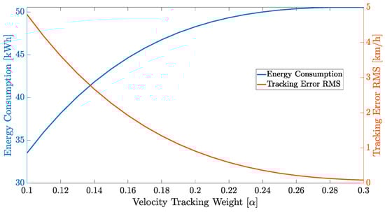 To tune the cost function according to both manual and autonomous driving mode, a weight sweeping is performed to determine the most suitable bias in the minimization of energy consumption and velocity tracking error in both driving modes. Hence, optimization is performed for α = 0.1–0.9. Figure 2 shows the trend in the change of tracking error rms and energy consumption as the velocity tracking weight (α) increases.