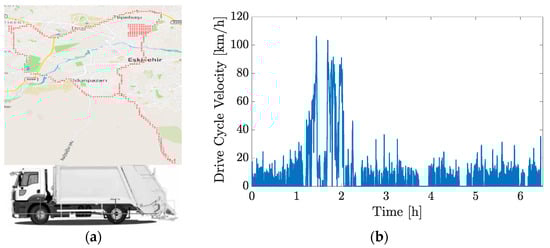 Eskisehir drive cycle: (a) Ford truck and collection points on the route and (b) speed profile.