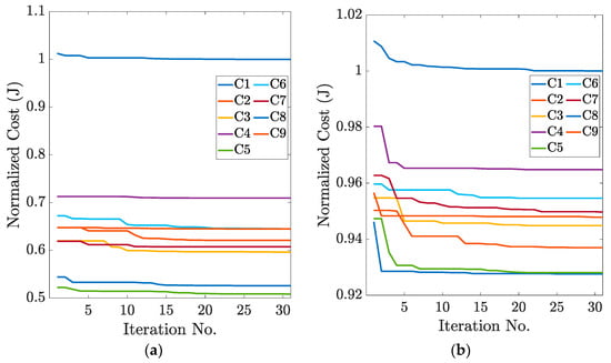 The optimization is performed offline to obtain the optimal controller gains for each candidate controller assigned to each subset of vehicle mass for both autonomous and manual driving modes. The drive cycle is also split into subsets corresponding to the subset of mass it overlaps with. The controller gains are optimized for only the subset in which the candidate controller lies, and not for the entire drive cycle. This reduced the simulation time by approximately 10 times. The convergence behavior of the PSO algorithm is illustrated in Figure 4a,b for both autonomous and manual driving modes, respectively, via the normalized progression of objective function values. The plots show a smooth and stable reduction in the cost function value, with convergence typically achieved well before the maximum number of iterations. This indicates that the optimization process is effective and does not suffer from premature stagnation or instability. The result reinforces the suitability of PSO for control parameter optimization in the proposed bMMC framework, even under varying payload conditions.