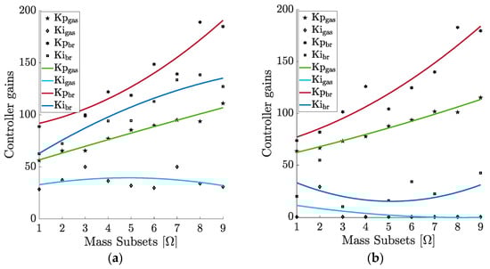 The number of candidate controllers is selected based on the truck’s payload variation range (9–18 t), divided into nine 1-tonne intervals, which results in nine mass subsets (N = 9) where  and  (Equation (9)). This granularity ensures sufficient responsiveness to mass changes without introducing excessive complexity or computational cost. Further subdivision offers negligible gains in performance during preliminary testing and is, therefore, not pursued.