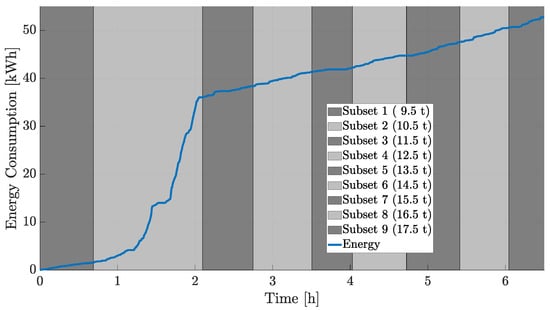 From Figure 6, it can be inferred that the cost values in both modes remained comparable, desirably, as the mass increased throughout the drive cycle. This can be explained by the fact that a decent normalization value, , is selected for each subset.  for each subset is selected as the energy consumption during the subset corresponding part of the cycle, as shown in Figure 7.