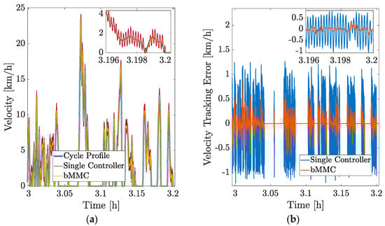 Figure 9 shows the velocity profile of the vehicle using a single controller and bMMC and, as expected, a significant amount of chatter is seen when using the single controller. In this aspect, bMMC performs better than the existing approaches. Furthermore, Figure 9 also shows the difference in velocity tracking error while using a single controller and bMMC. In the former case, the velocity tracking error is approximately 200% higher than in the latter case.