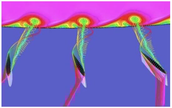 Vortices can be classified by their rotational axes: transverse vortices (TVs) have perpendicular axes to the main flow direction; longitudinal vortices (LVs), also referred to as streamwise vortices, on the other hand, have parallel ones. LVs are typically more efficient at improving heat transfer while only causing a minimal rise in pressure drop compared to TVs [2,6,7]. LVGs are utilized as a passive technique for augmenting heat transfer, involving the generation of streamwise vortices, as depicted in Figure 1, which induces heightened turbulence within the fluid flow across heat transfer surfaces [8].