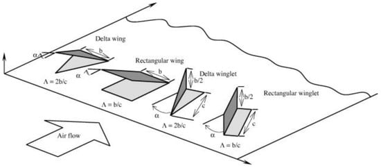 Diagram of modified rectangular winglet vortex generator and layout (a) common-flow-down configuration; (b) modified rectangular winglet [140].