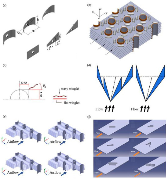 Four prevalent LVGs are illustrated in Figure 2, encompassing delta wings, delta winglets, rectangular wings, and rectangular winglets [10,11,12]. In addition to the primary four types, a variety of other LVGs have been explored and studied extensively in recent years. Studies on a range of winglet VGs were conducted by Zhou and Feng [13], Lu and Zhou [14], including delta, trapezoidal, and rectangular shapes, plane and curved designs, with and without holes, as depicted in Figure 3a. Wang et al. [5], and Lin et al. [15] proposed the application of annular winglet VGs to finned-tube heat exchangers, as shown in Figure 3b. Gholami et al. investigated the heat transfer enhancement in a finned-tube heat exchanger with wavy rectangular winglet VGs, as illustrated in Figure 3c [16]. He et al. introduced arrays of V-deployed VGs, inspired by animal locomotion in nature, as illustrated in Figure 3d [17]. Lotfi et al. explored the use of four distinct VG designs on wavy-finned elliptical-tube heat exchangers, including the wheeler wishbone (WW), angle rectangular winglet (ARW), curved angle rectangular winglet (CARW), and rectangular trapezoidal winglet (RTW), depicted in Figure 3e [18,19]. In addition to WW, ARW, and RTW, Samadifar and Toghraie also investigated the effect of the intended vortex generator (IVG) and waved vortex generator (WVG) on heat transfer in finned plate heat exchangers, as shown in Figure 3f [20].