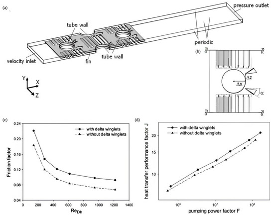 - Kwak, K.; Torii, K.; Nishino, K. Heat transfer and flow characteristics of fin-tube bundles with and without winglet-type vortex generators. Exp. Fluids 2002, 33, 696–702. [Google Scholar] [CrossRef]