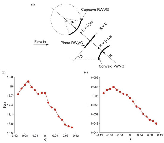 (a) K notation for plane, concave, and convex rectangular winglet VGs; (b) variation of Nusselt number versus K values; (c) variation of friction factor versus K values [86].