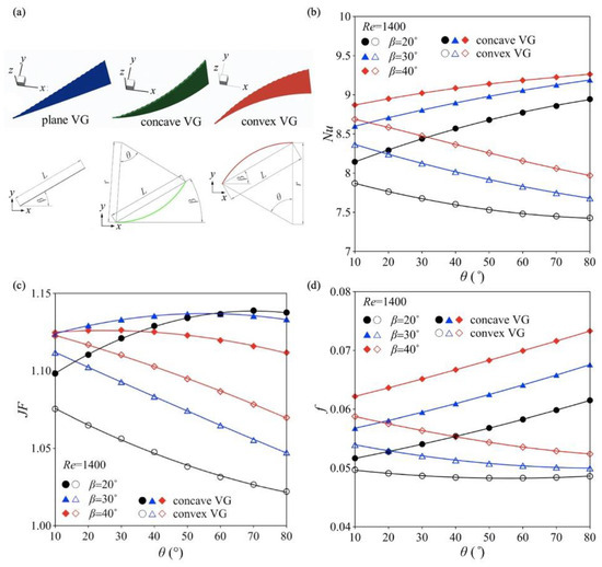 (a) Dimensional details of delta winglet VGs; (b) comparisons of Nusselt number between concave and convex curved VGs for different values of β and θ; (c) comparisons of surface goodness factor between concave and convex curved VGs for different values of β and θ; (d) comparisons of friction factor between concave and convex curved VGs for different values of β and θ [90].