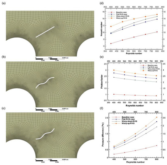 (a) flat rectangular winglet case; (b) wavy-down rectangular winglet case; (c) wavy-up rectangular winglet case; (d) variation of Nusselt number versus Reynolds number; (e) variation of friction factor with Reynolds number; (f) variation of pressure drop with Reynolds number [16].