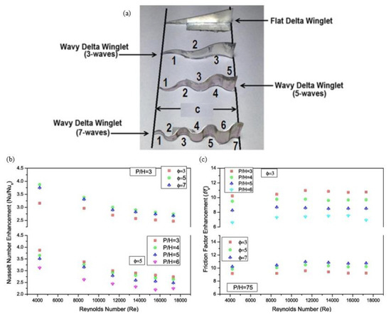 (a) Diagram of flat and wavy delta winglet with different wave numbers (3, 5, and 7); (b) variation of Nusselt number enhancement for various wave number (ϕ), relative longitudinal pitch (P/H), and Re; (c) variation of friction factor enhancement for various ϕ, P/H, and Re [150].