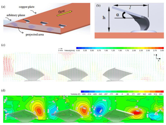 (a) isometric view of NTVG; (b) side view of NTVG; (c) vectors of secondary flow for NTVG at Re = 20,000; (d) vorticity contours for NTVG at Re = 20,000 [154].