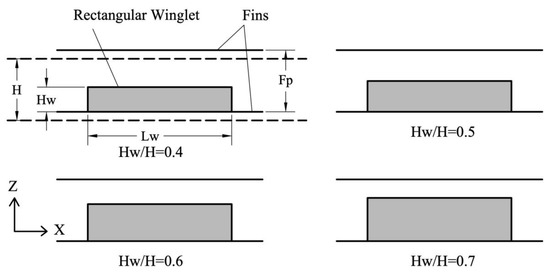 Wang et al. introduced wave-type VGs and identified that the application of these VGs significantly improved mixing characteristics [2]. When compared to plain fin geometry, the frictional penalty associated with these VGs was approximately 25–55% higher, with their pressure drop penalty exhibiting relatively low sensitivity to Reynolds number changes [2]. Wang et al. then compared the performance of annular and delta winglets, and they indicated that with identical winglet heights, the delta winglet induced more intense vortical motion and flow unsteadiness compared to the annular winglet, resulting in superior mixing [5]. Despite this enhanced mixing, the delta winglet incurred lower pressure drops than the annular winglet [5]. Additionally, when compared to plain fin geometry, the extra pressure drop penalty associated with these winglet VGs showed relatively little sensitivity to Reynolds number changes [5]. Wang et al. also investigated the heat transfer performance of semi-simple winglets, comparing their effectiveness to that of louvered fins [148]. The louver fin geometry exhibited superior heat transfer coefficients compared to the semi-dimple winglet geometry, largely attributed to enhanced fluid mixing [148]. For heat exchangers with 2 or 4 tube rows, the louver fin’s heat transfer coefficients were about 2–15% greater than those of the semi-dimple winglet setup [148]. As shown in Figure 9, Min et al. introduced modified RWPs created by cutting off the four corners of rectangular winglets, and the experimental findings demonstrated that these modified RWPs possess superior flow and heat transfer properties compared to traditional RWPs [140].