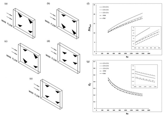 (a) CFU-CFU configuration; (b) CFD-CFD configuration; (c) CFD-CFU configuration; (d) SRW configuration; (e) IRW configuration; (f) variation of average combined spanwise Nusselt number for various setups versus Reynolds number; (g) variation of average Quality factor for various setups versus Reynolds number [61].