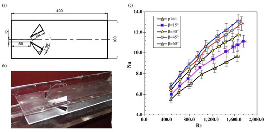 (a) Dimensions and position of DWP on the plate at the angle of attack of = 30°; (b) tested plate punched with DWP; (c) variation of average Nusselt number for various attack angles versus Reynolds number [141].