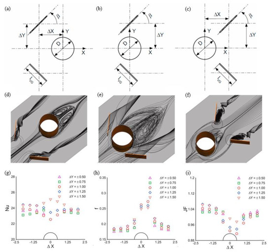 (a) Upstream RWP location (ΔX < 0); (b) adjacent RWP location (ΔX = 0); (c) downstream RWP location (ΔX > 0); (d) flow pattern for upstream located RWP; (e) flow pattern for adjacent located RWP; (f) flow pattern for downstream located RWP; (g) variation of Nusselt number versus RWP locations; (h) variation of friction factor versus RWP locations; (i) variation of JF versus RWP locations [101].