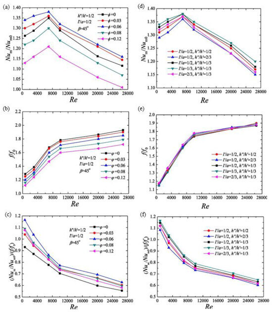 For various hole diameters: (a) variation of Num/Num0 versus Reynolds number; (b) variation of f/f0 versus Reynolds number; (c) variation of (Num/Num0)/(f/f0) versus Reynolds number; for different hole position: (d) variation of Num/Num0 versus Reynolds number; (e) variation of f/f0 versus Reynolds number; (f) variation of (Num/Num0)/(f/f0) versus Reynolds number [14].