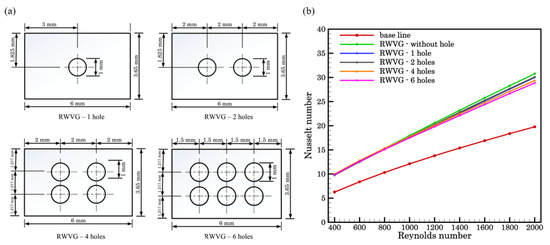 (a) Dimensional details of rectangular winglet VGs with 1, 2, 4, and 6 punched holes; (b) variation of Nusselt number versus Reynolds number [97].