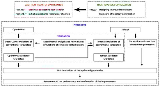 Despite many works and applications utilizing TO in different fields, the literature lacks studies about TO in high aspect ratio rectangular channels, which are fundamental in many devices and engineering applications where highly efficient thermal management is required, e.g., small-scale and microchannel heat exchangers, thermal control systems for on-Earth, aeronautics, and space applications, and the cooling of fuel cells and automotive batteries, nuclear reactors, and solar collectors. Additionally, these channels are also applicable to a broader range of systems that require extended and thin surfaces for enhanced thermal performance. As a consequence, in the present work, an investigation has been carried out to identify innovative turbulator geometries aimed at enhancing heat transfer in a high aspect ratio rectangular channel, which has already been widely studied both numerically [,,,] and experimentally [] by the authors, but only when equipped with traditional turbulators. A topology optimization approach has been applied using the Physics-Driven Generative Design Platform ToffeeX [], resulting in the creation of novel turbulator designs. Several configurations have been numerically tested to evaluate their thermal performance, and the most promising ones have been further assessed through additional more refined and detailed simulations employing the Reynolds-Averaged Navier–Stokes (RANS) model in OpenFOAM.