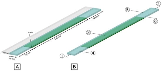 Simulation domain with (A) main dimensions, (B) boundaries (1—inlet, 2—outlet, 3—upper wall, 4—lower wall, 5—plane of symmetry, 6—lateral wall).