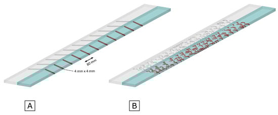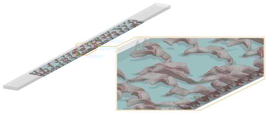 The designated topology optimization region (denoted in green in Figure 2) begins 220 mm downstream from the inlet and extends 840 mm along the channel length. This positioning preserves the remaining channel section from flow perturbations to mitigate potential reverse flow phenomena. The optimization region features a reduced height of 4 mm compared to the full channel height of 12 mm while spanning the entire width of 120 mm. These dimensional constraints have been specifically implemented to generate turbulator configurations within geometric parameters comparable to those previously investigated. In particular, extensive experimental results have already been acquired by the authors about standard V-shaped turbulators with the same height; thus, they allow direct comparative analysis between numerical and experimental data for this channel configuration. To give a first idea of the shape of the turbolators obtainable by TO, with respect to the more standard ones, Figure 3A shows the investigated domain with V-down turbulators while Figure 3B shows an example of the optimized obstacles, which will be more thoroughly described in the following sections.
