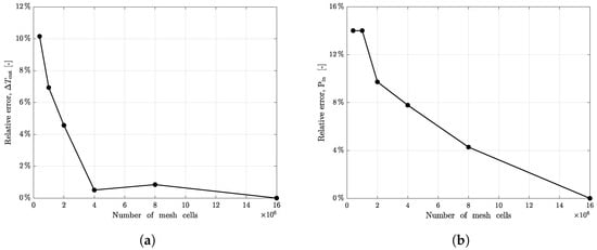 Initially, a sensitivity analysis has been performed within the software ToffeeX. Due to symmetry, half of a channel equipped with adiabatic V-down ribs (, apexes of the V pointing in the direction of flow) on the lower wall has been modeled on different meshes, respectively, of 400 k, 1 M, 2 M, 4 M, 8 M, and 16 M cells. The bulk outlet temperature and the pressure calculated at the inlet (which corresponds to the pressure difference along the whole channel) have been used as parameters for the mesh sensitivity analysis, showing that a 4 M cells mesh can be used without wasting computational resources and time, avoiding introducing a consistent error with respect to the value obtained for a finer mesh. The relative error e, computed by the following equations (Equations (4) and (5)), has been applied for the comparisons, and the obtained data are shown in Figure 4.