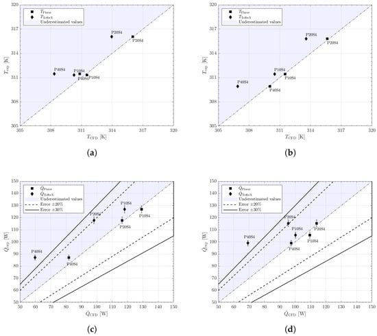 An overview of the validation of the CFD model implemented in ToffeeX: (a) Outlet bulk temperature comparisons for V-down configuration. (b) Outlet bulk temperature comparisons for V-up configuration. (c) Heat transfer rate comparisons for V-down configuration. (d) Heat transfer rate comparisons for V-up configuration.