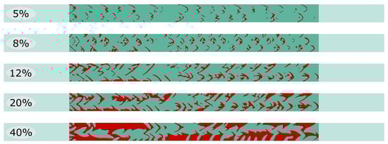 Since differences within the range of 6–10% are negligible and are even more so within the range 7–9%, the 8% solid volumetric fraction has been chosen to perform an accurate topology optimization simulation. The results showed a notable increase in the outlet temperature. Specifically, the optimized design with this solid volumetric fraction led to a temperature increase of nearly 30% compared to a channel with standard V-down ribs, as depicted in Figure 8c. The resulting turbulators can be seen in details also in Figure 6. The proposed channel demonstrates significant potential for practical use due to its high compatibility with common industrial applications and manufacturing techniques.