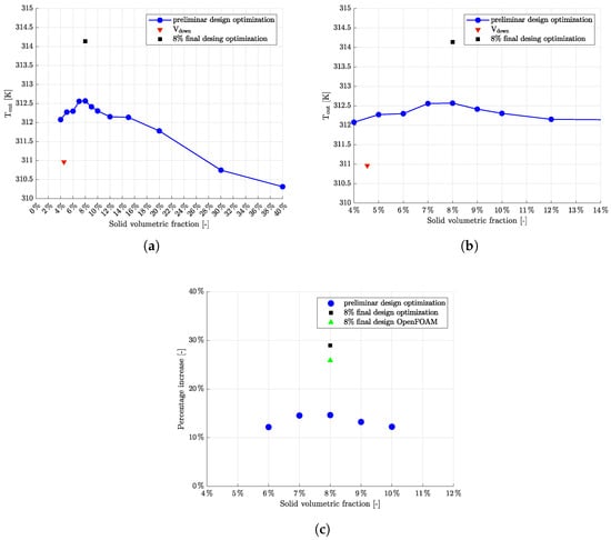 Results on after topology optimization at different solid volumetric fractions: (a) Outlet bulk temperature distribution of the overall range tested. (b) Zoom in on the outlet bulk temperature distribution. (c) Percentage increase of the most promising configurations.