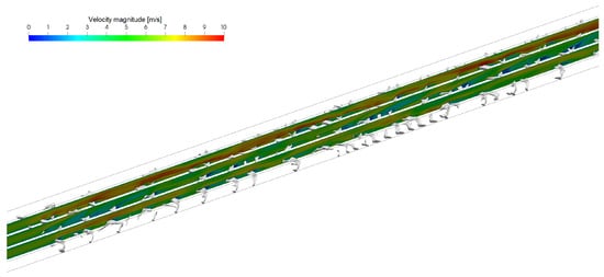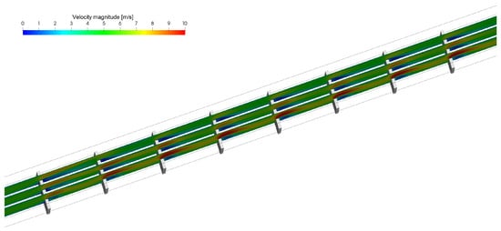 To validate the numerical setup, a simulation has also been performed on the P20S4 V-down ribs test case, for which, as already said, both previous high-resolution simulations performed with Ansys Fluent 2023 R1 and accurate experimental results are available []. The values predicted by the OpenFOAM simulation are 114 W for the total heat transfer rate and 88.93 W/m2K for the convective heat transfer coefficient h, in good agreement with the previously determined values ( W and W/m2K []). With respect to the experimental values, errors are around 3% for the total heat transfer rate and 10% for the convective heat transfer coefficient computed from the energy balance ( W and W/m2K []).