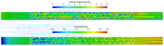 As hinted at in the previous sections, after validation, the numerical setup using OpenFOAM has been used to perform the final simulation with the turbulators at 8% filling volume percentage. The resulting bulk temperature is 316.97 K, with a percentage increase of 25.87% with respect to the reference V-down ribs case, as illustrated in Figure 8. This substantial enhancement further supports the validity of the proposed design strategy.