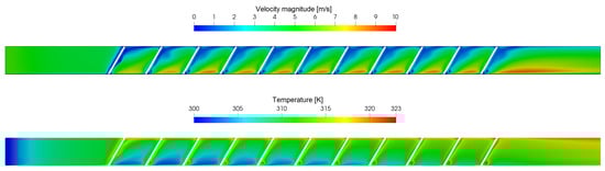 Figure 11 and Figure 12 show the velocity and temperature fields on a horizontal slice of the domain at a 1 mm height from the bottom boundary, for the ToffeeX 8% filling volume percentage case and for the P20S4 V-down ribs case, respectively.