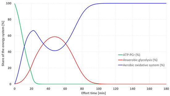 The red line shows the contribution of anaerobic glycolysis. This system begins to play a dominant role after the ATP-PCr reserves are depleted. Its contribution to energy production increases rapidly, reaching its maximum in the time interval of ca. 45–60 s of exercise. Anaerobic glycolysis is a key energy system during medium-length, high-intensity efforts, such as running 400–800 m. After about 90 s of activity, the contribution of this system begins to gradually decrease. The blue curve shows the contribution of the aerobic (oxidative) system. Initially, its contribution to energy production is small, but it systematically increases with increasing exercise duration. The aerobic system becomes the dominant source of energy after ca. 90–120 s of physical activity. Long-term efforts, such as long-distance running or cycling, rely primarily on this metabolic system [29].