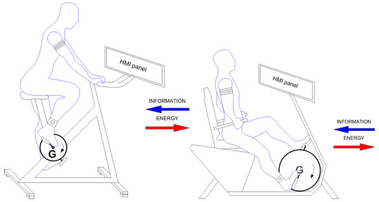 Commercially available stationary bicycles equipped with integrated generators are a popular example of using pedaling energy to produce electricity. The kinetic energy of the rotational movement of the pedals is converted into electrical energy, which can be directly used to power built-in control panels, lighting, or external electronic devices connected to the bicycle. Alternatively, the generated energy can be stored in batteries, enabling its later use. Stationary bicycles are divided into upright and recumbent bicycle designs (Figure 3).
