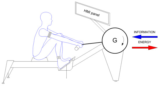 As a result of the authors’ cooperation, an innovative training and diagnostic device was developed that allows for simultaneous physical exercise, body diagnostics, and generation of electrical energy. The system consists of three main components (Figure 8): a mechanical part, which enables the transfer of mechanical energy from the user to the device; a mechanical energy conversion unit, including a generator (G) and a power electronic converter; and a supervision system, monitoring the device’s operating parameters and the user’s vital functions.