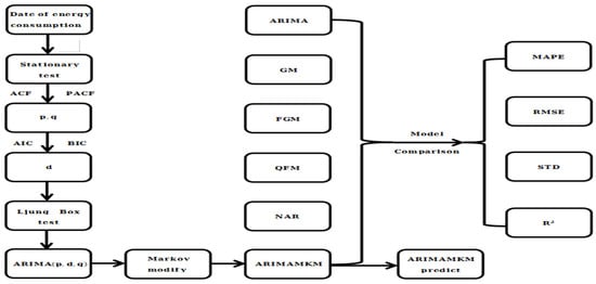 We propose an auto regressive integrated moving average Markov model (ARIMAMKM) for predicting annual energy consumption in China and enhancing the accuracy of energy consumption forecasts. This novel model extends the traditional auto regressive integrated moving average (ARIMA()) model. The stationarity of China’s energy consumption data from 2000 to 2018 is assessed, with an augmented Dickey–Fuller (ADF) test conducted on the -order difference series. Based on the auto correlation function (ACF) and partial auto correlation function (PACF) plots of the difference time series, the optimal parameters and are selected using the Akaike information criterion (AIC) and Bayesian information criterion (BIC), thereby determining the specific ARIMA configuration. By simulating real values using the ARIMA model and calculating relative errors, the estimated values are categorized into states. These states are then combined with a Markov transition probability matrix to determine the final predicted values. The ARIMAMKM model is validated using China’s energy consumption data, achieving high prediction accuracy as evidenced by metrics such as mean absolute percentage error (MAPE), root mean square error (RMSE), , and . Comparative analysis demonstrates that the ARIMAMKM model outperforms five other competitive models: the grey model (GM(1,1)), ARIMA(0,4,2), quadratic function model (QFM), nonlinear auto regressive neural network (NAR), and fractional grey model (FGM(1,1)) in terms of fitting performance. Additionally, the model is applied to Guangdong province’s resident population data to further verify its validity and practicality.