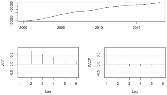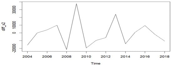 First, the stationarity of the raw time series is evaluated. As shown in Figure 2 and Table 2, the total energy consumption data from the China Statistical Yearbook (2000–2018) continuously increases and exhibits a clear trend, indicating that it is a non-stationary series. Therefore, the difference is required to transform it into a stationary series. From Figure 3, it can be seen that after the fourth-order difference, the total energy consumption series becomes stationary.