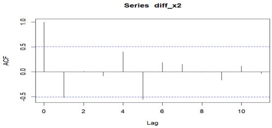During the model selection process, the AIC and BIC criteria were used. The AIC and BIC values of the seven models were calculated and summarized in Table 4. From Table 4, it is observed that the MA(2) model has the smallest AIC = 323.9768 and BIC = 326.809 among the three models. Since the data are already different by four orders (i.e., = 4), the final model is determined to be ARIMA(0,4,2). Next, we perform a significance test on the model.