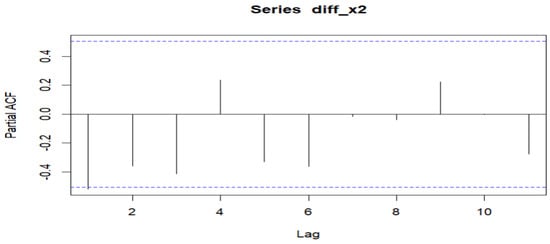 The ADF test is conducted on the series after fourth-order difference to evaluate the stationarity of the difference series. The test results from Table 3 show that the -value = 0.01, which is below the significance level of 0.05. Based on this result, we can reject the null hypothesis at the 95% confidence level, confirming that the difference series is stationary. The “Ljung-Box” test is then employed to check the residual sequence for white noise. From the test results in Table 3, it can be observed that the -value for the white noise test is 0.02623, which is below the significance level of 0.05. Therefore, the sequence passes the test at the 95% confidence interval. Thus, it can be concluded that the sequence after the fourth-order difference is a stationary, non-white noise series, meeting the modeling requirements. Based on this conclusion, the ARIMA() model can be further established for empirical analysis, with = 4.