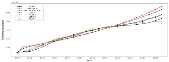 Due to the complexity of the energy consumption system, it is influenced by numerous factors and constraints. In light of international circumstances and domestic developmental requirements, the study of total energy consumption has garnered increasing attention and interest from scholars both domestically and internationally. This research has a long history in the field of statistics, and existing studies on energy consumption demand have employed various methods and models for analysis and forecasting. For instance, Shu et al. [1] utilized the environmental Kuznets curve (EKC) to simulate the relationship between energy consumption and carbon emissions in China, analyzed future trends, and determined the peak years for energy consumption and carbon emissions. Based on the ARIMA model, Li et al. [2] forecasted Beijing’s total energy consumption and proposed corresponding policy recommendations according to the forecast results. Wu et al. [3] combined the nonlinear grey Bernoulli (NGBM(1,1)) model with an interface particle swarm optimization algorithm to optimize parameters and predict short-term renewable energy consumption during China’s “13th Five-Year Plan” period, achieving high prediction accuracy. He [4] compared the prediction effects of two improved GM(1,1) methods and their combination using China’s total energy consumption data from 2007 to 2022 and applied the δRGM(1,1) model to forecast total energy consumption from 2023 to 2027. Shan [5] constructed a multiple regression model based on the stochastic impacts by regression on population, affluence, and technology (STIRPAT) model to analyze China’s energy consumption-related carbon emissions and applied the model to forecast carbon emissions from 2023 to 2035 under different scenarios. Dietz et al. [6,7] introduced the STIRPAT model, which expanded population, per capita wealth, and technology factors to examine the impact of additional factors on carbon emissions.
