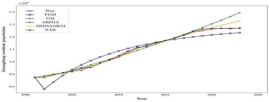To validate the effectiveness and adaptability of our proposed model, following the same procedure outlined in Section 3, we establish ARIMA(1,2,1), GM, FGM, NAR, and ARIMAMKM models to predict the permanent resident population in Guangdong Province. The permanent resident population data are from the Guangdong Statistical Yearbook. The results are summarized in Table 9 and depicted in Figure 7. The ARIMAMKM model forecasts the resident population of Guangdong for the years 2024–2027 to be 13,434.61, 13,595.98, 13,755.60, and 13,907.23 (unit: 10,000), respectively.