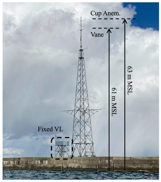 As shown in Figure 3, a fixed VL and metmast are installed on the breakwater in St. B. To verify the motion-induced error in the standard deviation of wind speed and TI measurements by FLSs, Windcube V2.1, a pulsed VL installed on the fixed observation platform is mainly used for reference wind data. The fixed VL is configured to measure wind speed (10 min average and standard deviation) and wind direction (10 min average) up to 250 m above the mean sea level (AMSL), including several predefined representative heights (63, 120, and 180 m). For convenience, all measurement heights are represented as AMSL in this study unless otherwise specified. Table 1 shows the configuration of the fixed VL. The verification is carried out using approximately one year of data, from 11 December 2020 to 23 November 2021. The data availability of the fixed VL has been confirmed to be above 90%.