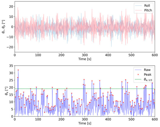 where N is the number of peaks within the window, set as 10 min, and are the individual maximal values of the buoy tilt sorted in descending order. Thus, is a quantitative parameter reflecting the level of the buoy’s motion and is analyzed together with the peak period of the roll and pitch angles of the buoy. As an example, Figure 4 shows a time series of the roll , pitch , and tilt , and the calculated within an arbitrary 10 min for the Fugro SEAWATCH buoy.