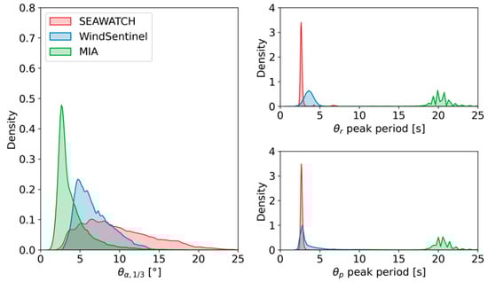 Probability densities of the FLS buoys’ significant tilt (left) and peak periods of roll (upper right) and pitch (bottom right).